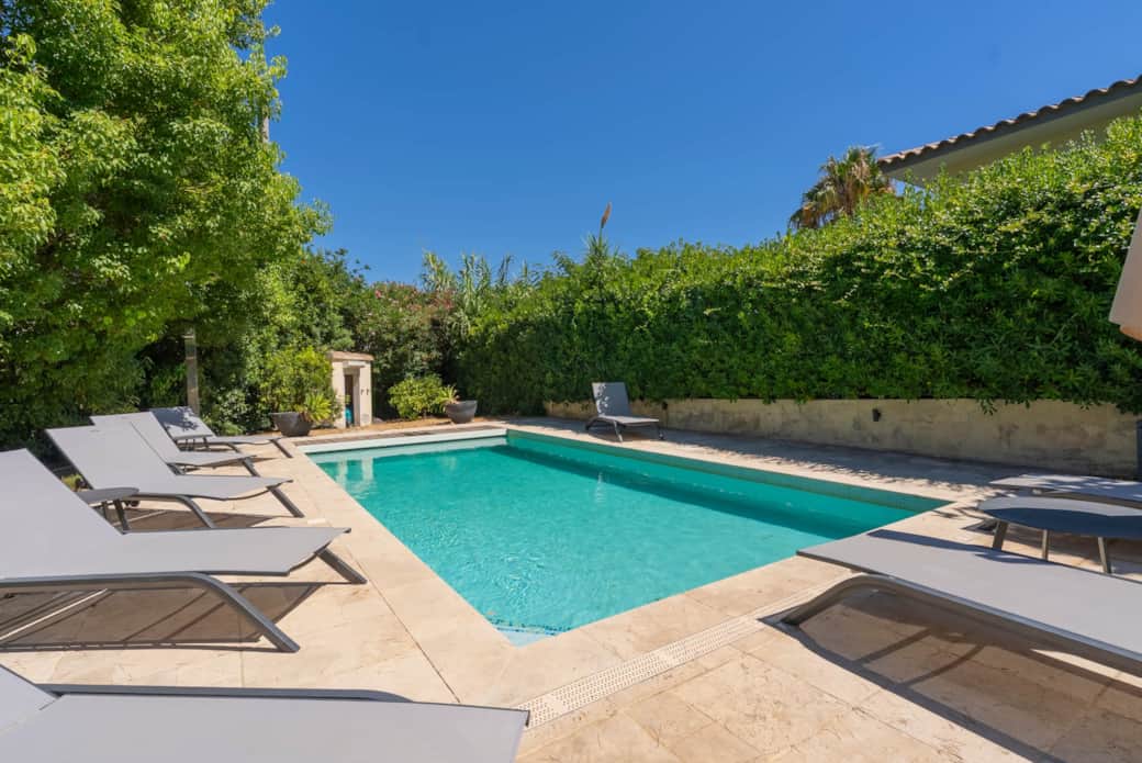 piscine est nichée au cœur du jardin clos de la villa, à l'abri des